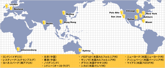 高度なルーティング技術(IPエニーキャスト技術)を活用し、問い合わせ元から位置的に最も近いDNSサーバー(世界14拠点にあるDNSサーバーのうちの一つ)がそれに応え名前解決をする仕組みになっています。これにより、世界のどこからの問い合わせであっても、総体的に見て、早いレスポンスを返すことが可能になっています。