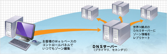 世界14拠点に2台ずつのDNSサーバーを配置し、そのすべてのDNSサーバーにお客様のゾーンファイルを設定します。この冗長構成により、100%のアップタイム(ダウンタイム・ゼロ)を保証するサービスを実現しています。